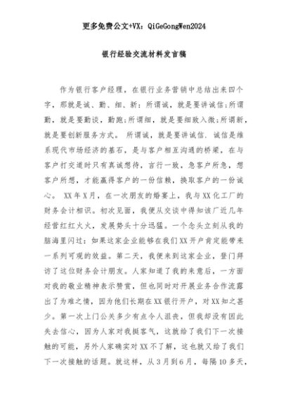 【七哥公文】2025年:银行经验交流材料发言稿+更多免费公文+VX:QiGeGongWen2024+更多免费公文+VX:QiGeGongWen2024