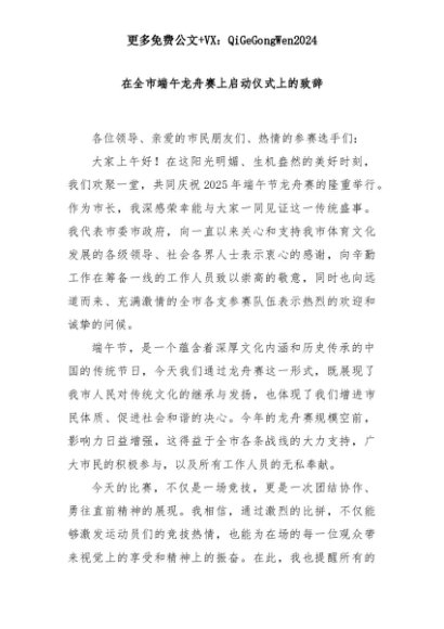 【七哥公文】2025年:在全市端午龙舟赛上启动仪式上的致辞+更多免费公文+VX:QiGeGongWen2024+更多免费公文+VX:QiGeGongWen2024
