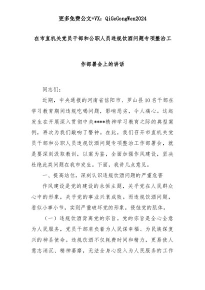 【七哥公文】2025年:在市直机关党员干部和公职人员违规饮酒问题专项整治工作部署会上的讲话+更多免费公文+VX:QiGeGongWen2024+更多免费公文+VX:QiGeGongWen2024