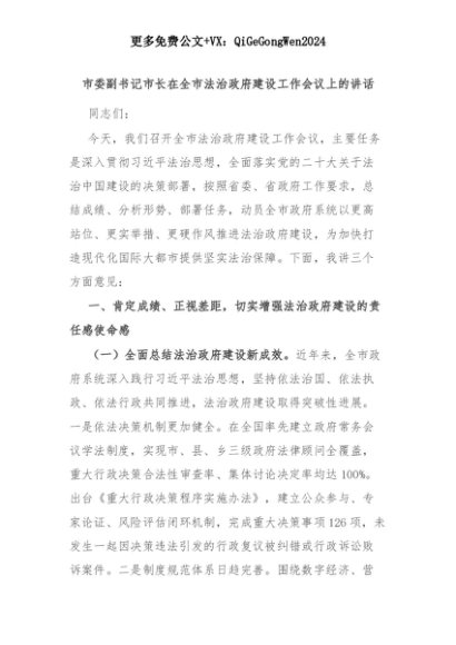 【七哥公文】2025年:市委副书记市长在全市法治政府建设工作会议上的讲话+更多免费公文+VX:QiGeGongWen2024+更多免费公文+VX:QiGeGongWen2024