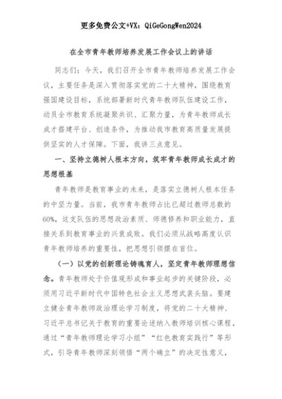 【七哥公文】2025年:在全市青年教师培养发展工作会议上的讲话+更多免费公文+VX:QiGeGongWen2024+更多免费公文+VX:QiGeGongWen2024