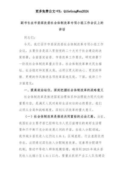 【七哥公文】2025年:副市长在市委深改委社会体制改革专项小组工作会议上的讲话+更多免费公文+VX:QiGeGongWen2024+更多免费公文+VX:QiGeGongWen2024