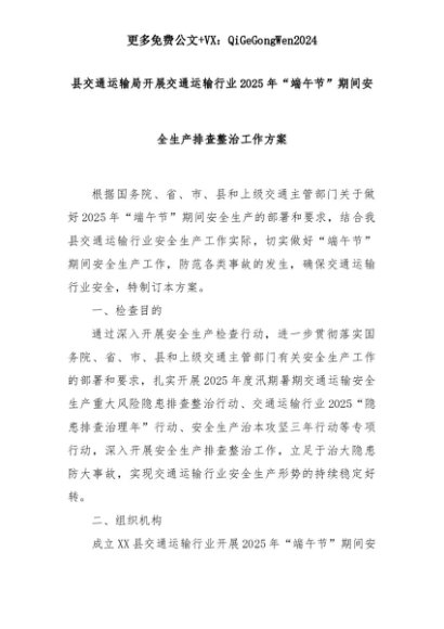 【七哥公文】2025年:县交通运输局开展交通运输行业2025年“端午节”期间安全生产排查整治工作方案+更多免费公文+VX:QiGeGongWen2024+更多免费公文+VX:QiGeGongWen2024