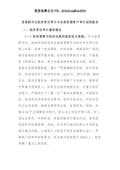 【七哥公文】2025年:县委副书记经济责任审计与自然资源资产审计述职报告+更多免费公文+VX:QiGeGongWen2024+更多免费公文+VX:QiGeGongWen2024