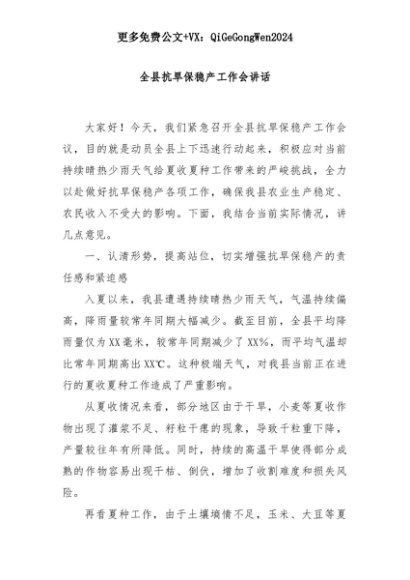【七哥公文】2025年:全县抗旱保稳产工作会讲话+更多免费公文+VX:QiGeGongWen2024+更多免费公文+VX:QiGeGongWen2024