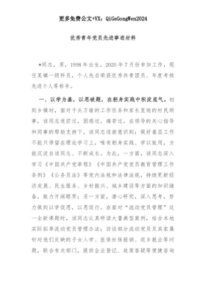 【七哥公文】2025年:优秀青年党员先进事迹材料+更多免费公文+VX:QiGeGongWen2024+更多免费公文+VX:QiGeGongWen2024