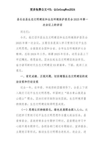 【七哥公文】2025年:县长在县生态文明建设和生态环境保护委员会2025年第一次会议上的讲话+更多免费公文+VX:QiGeGongWen2024+更多免费公文+VX:QiGeGongWen2024