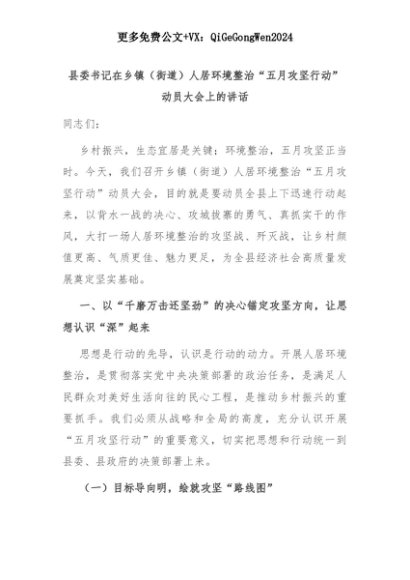 【七哥公文】2025年:县委书记在乡镇(街道)人居环境整治“五月攻坚行动”动员大会上的讲话+更多免费公文+VX:QiGeGongWen2024+更多免费公文+VX:QiGeGongWen2024