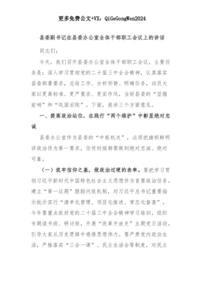 【七哥公文】2025年:县委副书记在县委办公室全体干部职工会议上的讲话+更多免费公文+VX:QiGeGongWen2024+更多免费公文+VX:QiGeGongWen2024
