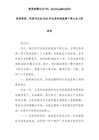 【七哥公文】2025年:县委常委、纪委书记在2025年全县纪检监察干部大会上的讲话+更多免费公文+VX:QiGeGongWen2024+更多免费公文+VX:QiGeGongWen2024