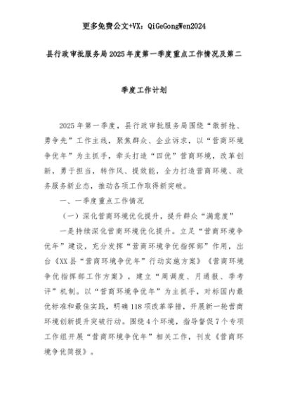 【七哥公文】2025年:县行政审批服务局2025年度第一季度重点工作情况及第二季度工作计划+更多免费公文+VX:QiGeGongWen2024+更多免费公文+VX:QiGeGongWen2024