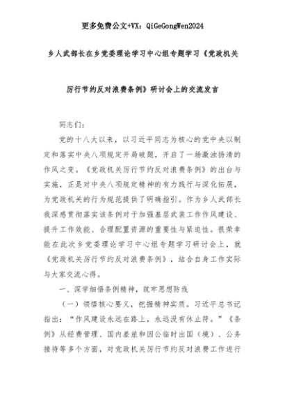 【七哥公文】2025年:乡人武部长在乡党委理论学习中心组专题学习《党政机关厉行节约反对浪费条例》研讨会上的交流发言+更多免费公文+VX:QiGeGongWen2024+更多免费公文+VX:QiGeGongWen2024
