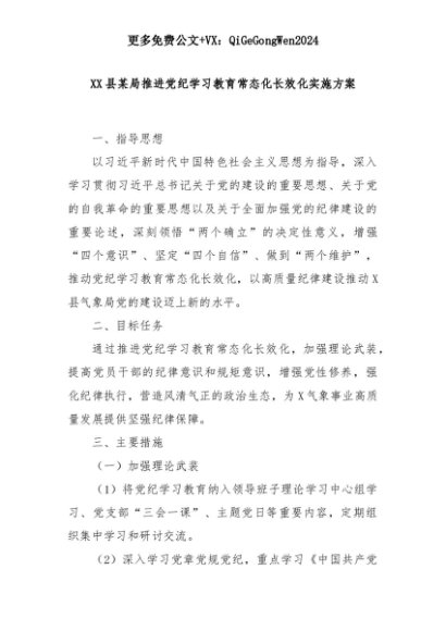 【七哥公文】2025年:XX县某局推进党纪学习教育常态化长效化实施方案+更多免费公文+VX:QiGeGongWen2024+更多免费公文+VX:QiGeGongWen2024