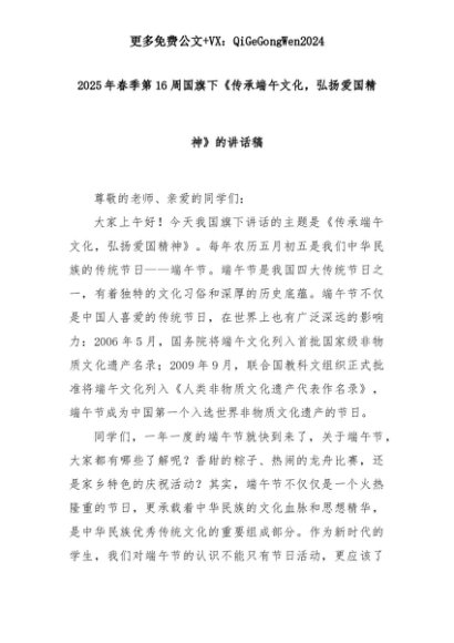 【七哥公文】2025年:2025年春季第16周国旗下《传承端午文化,弘扬爱国精神》的讲话稿+更多免费公文+VX:QiGeGongWen2024+更多免费公文+VX:QiGeGongWen2024