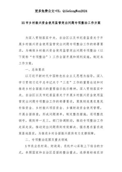 【七哥公文】2025年:XX市乡村振兴资金使用监管突出问题专项整治工作方案+更多免费公文+VX:QiGeGongWen2024+更多免费公文+VX:QiGeGongWen2024