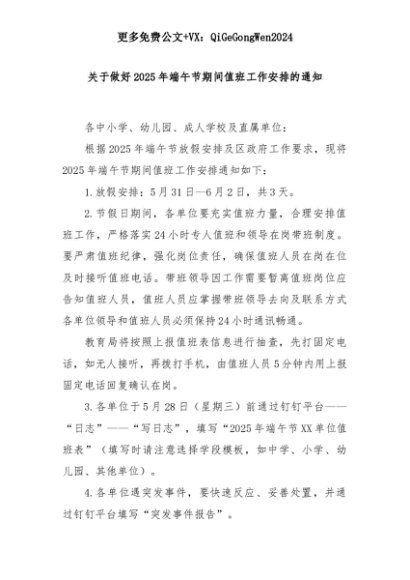 【七哥公文】2025年:关于做好2025年端午节期间值班工作安排的通知+更多免费公文+VX:QiGeGongWen2024+更多免费公文+VX:QiGeGongWen2024