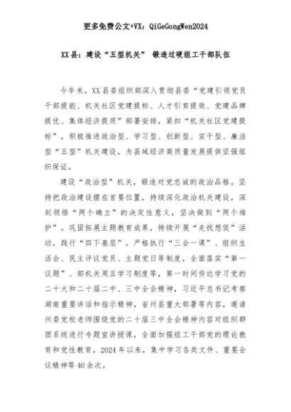 【七哥公文】2025年:XX县:建设“五型机关” 锻造过硬组工干部队伍+更多免费公文+VX:QiGeGongWen2024+更多免费公文+VX:QiGeGongWen2024