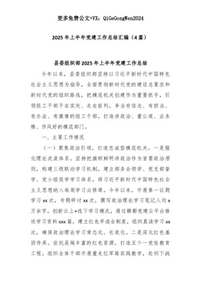 【七哥公文】2025年:(4篇)2025年上半年党建工作总结汇编+更多免费公文+VX:QiGeGongWen2024+更多免费公文+VX:QiGeGongWen2024
