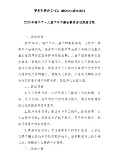 【七哥公文】2025年:2025年端午节·儿童节双节融合教育活动实施方案+更多免费公文+VX:QiGeGongWen2024+更多免费公文+VX:QiGeGongWen2024