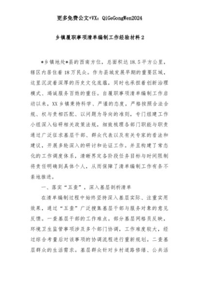 【七哥公文】2025年:乡镇履职事项清单编制工作经验材料2+更多免费公文+VX:QiGeGongWen2024+更多免费公文+VX:QiGeGongWen2024
