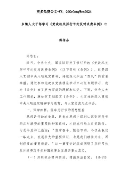 【七哥公文】2025年:乡镇人大干部学习《党政机关厉行节约反对浪费条例》心得体会+更多免费公文+VX:QiGeGongWen2024+更多免费公文+VX:QiGeGongWen2024