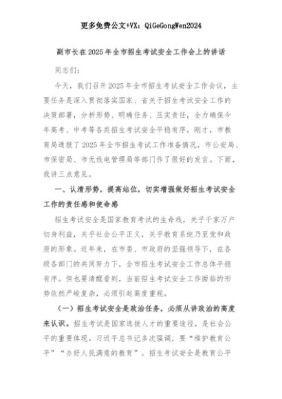 【七哥公文】2025年:副市长在2025年全市招生考试安全工作会上的讲话+更多免费公文+VX:QiGeGongWen2024+更多免费公文+VX:QiGeGongWen2024