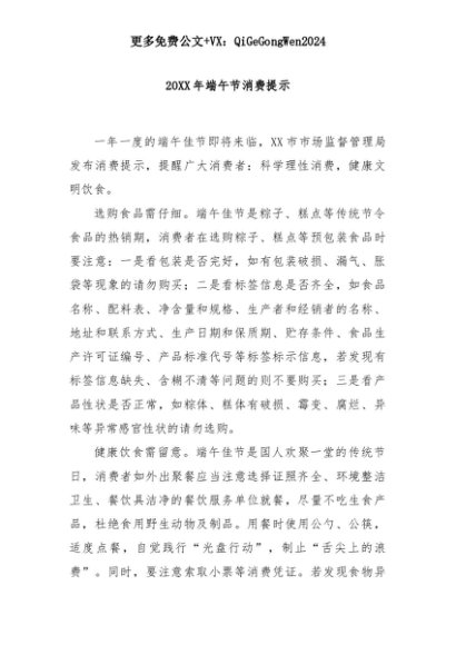 【七哥公文】2025年:20XX年端午节消费提示+更多免费公文+VX:QiGeGongWen2024+更多免费公文+VX:QiGeGongWen2024