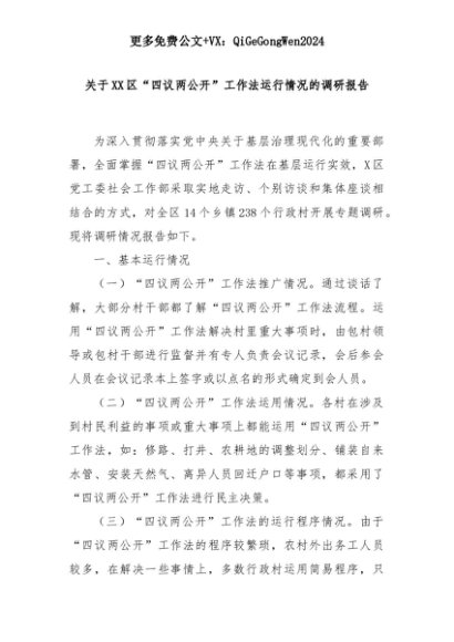 【七哥公文】2025年:关于XX区“四议两公开”工作法运行情况的调研报告+更多免费公文+VX:QiGeGongWen2024+更多免费公文+VX:QiGeGongWen2024