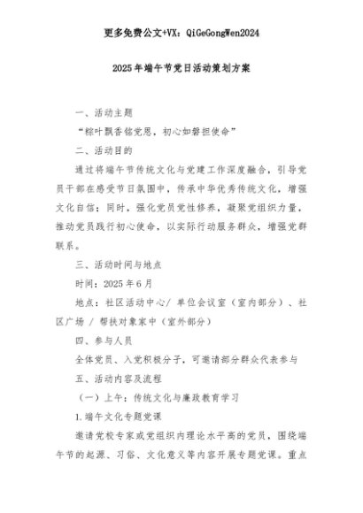 【七哥公文】2025年:2025年端午节党日活动策划方案+更多免费公文+VX:QiGeGongWen2024+更多免费公文+VX:QiGeGongWen2024