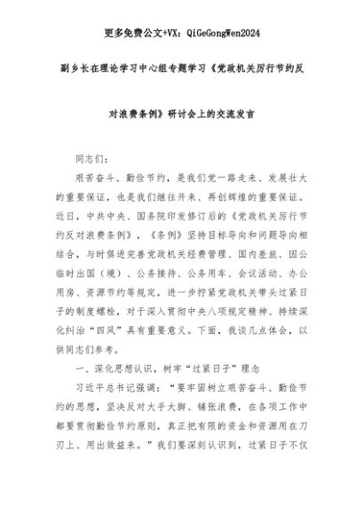 【七哥公文】2025年:副乡长在理论学习中心组专题学习《党政机关厉行节约反对浪费条例》研讨会上的交流发言+更多免费公文+VX:QiGeGongWen2024+更多免费公文+VX:QiGeGongWen2024