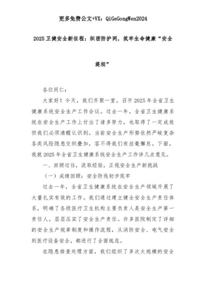 【七哥公文】2025年:2025卫健安全新征程:织密防护网,筑牢生命健康“安全堤坝”+更多免费公文+VX:QiGeGongWen2024+更多免费公文+VX:QiGeGongWen2024