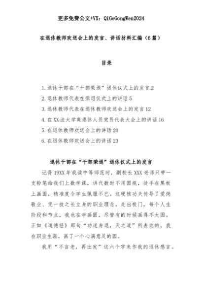 【七哥公文】2025年:(6篇)在退休教师欢送会上的发言、讲话材料汇编+更多免费公文+VX:QiGeGongWen2024+更多免费公文+VX:QiGeGongWen2024