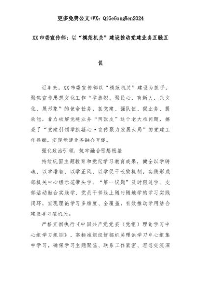 【七哥公文】2025年:XX市委宣传部:以“模范机关”建设推动党建业务互融互促+更多免费公文+VX:QiGeGongWen2024+更多免费公文+VX:QiGeGongWen2024