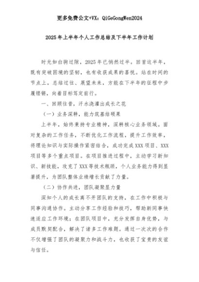 【七哥公文】2025年:2025年上半年个人工作总结及下半年工作计划+更多免费公文+VX:QiGeGongWen2024+更多免费公文+VX:QiGeGongWen2024