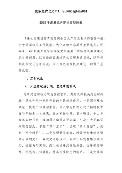 【七哥公文】2025年:2025年清廉机关建设典型经验+更多免费公文+VX:QiGeGongWen2024+更多免费公文+VX:QiGeGongWen2024