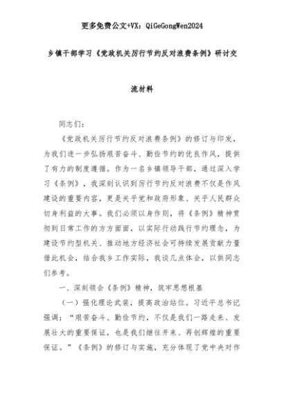【七哥公文】2025年:乡镇干部学习《党政机关厉行节约反对浪费条例》研讨交流材料+更多免费公文+VX:QiGeGongWen2024+更多免费公文+VX:QiGeGongWen2024