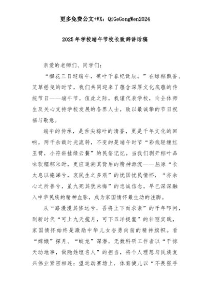【七哥公文】2025年:2025年学校端午节校长致辞讲话稿+更多免费公文+VX:QiGeGongWen2024+更多免费公文+VX:QiGeGongWen2024
