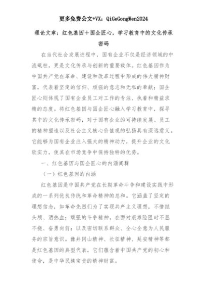【七哥公文】2025年:理论文章:红色基因+国企匠心,学习教育中的文化传承密码+更多免费公文+VX:QiGeGongWen2024+更多免费公文+VX:QiGeGongWen2024