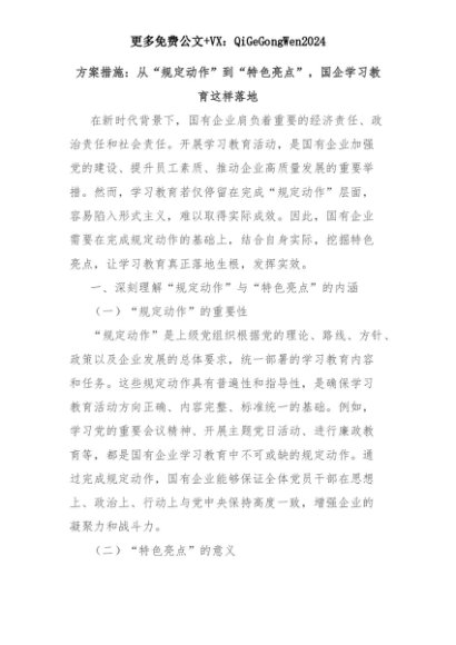 【七哥公文】2025年:方案措施:从“规定动作”到“特色亮点”,国企学习教育这样落地+更多免费公文+VX:QiGeGongWen2024+更多免费公文+VX:QiGeGongWen2024