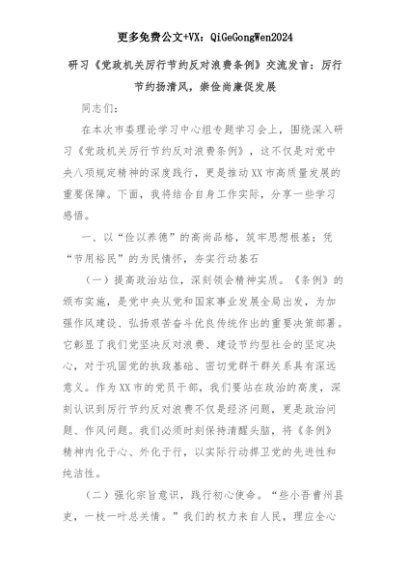 【七哥公文】2025年:研习《党政机关厉行节约反对浪费条例》交流发言:厉行节约扬清风,崇俭尚廉促发展+更多免费公文+VX:QiGeGongWen2024+更多免费公文+VX:QiGeGongWen2024