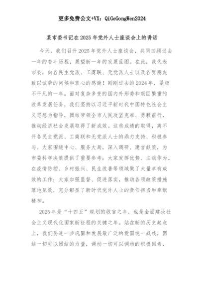【七哥公文】2025年:某市委书记在2025年党外人士座谈会上的讲话+更多免费公文+VX:QiGeGongWen2024+更多免费公文+VX:QiGeGongWen2024