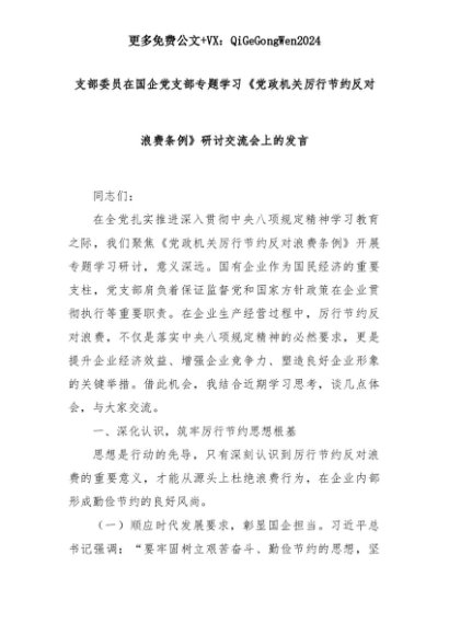 【七哥公文】2025年:支部委员在国企党支部专题学习《党政机关厉行节约反对浪费条例》研讨交流会上的发言+更多免费公文+VX:QiGeGongWen2024+更多免费公文+VX:QiGeGongWen2024