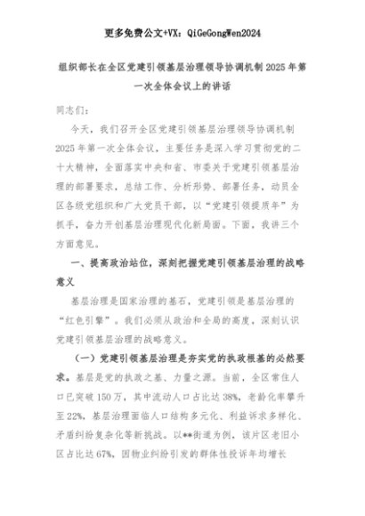 【七哥公文】2025年:组织部长在全区党建引领基层治理领导协调机制2025年第一次全体会议上的讲话+更多免费公文+VX:QiGeGongWen2024+更多免费公文+VX:QiGeGongWen2024