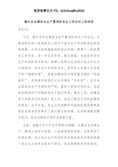 【七哥公文】2025年:镇长在全镇安全生产暨消防安全工作会议上的讲话+更多免费公文+VX:QiGeGongWen2024+更多免费公文+VX:QiGeGongWen2024