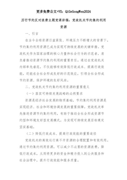 【七哥公文】2025年:厉行节约反对浪费主题党课讲稿:党政机关节约集约利用资源+更多免费公文+VX:QiGeGongWen2024+更多免费公文+VX:QiGeGongWen2024