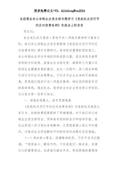 【七哥公文】2025年:总经理在非公有制企业党支部专题学习《党政机关厉行节约反对浪费条例》交流会上的发言+更多免费公文+VX:QiGeGongWen2024+更多免费公文+VX:QiGeGongWen2024