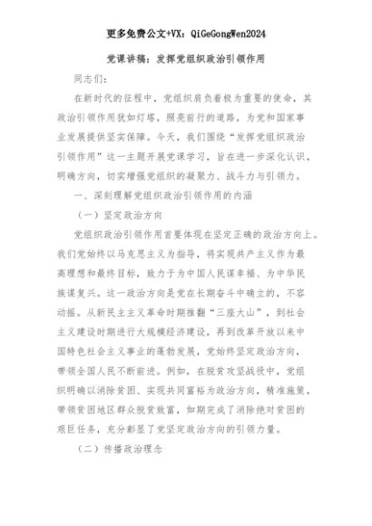 【七哥公文】2025年:党课讲稿:发挥党组织政治引领作用+更多免费公文+VX:QiGeGongWen2024+更多免费公文+VX:QiGeGongWen2024