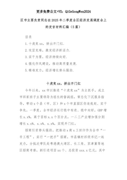 【七哥公文】2025年:(5篇)区市主要负责同志在2025年二季度全区经济发展调度会上的发言材料汇编+更多免费公文+VX:QiGeGongWen2024+更多免费公文+VX:QiGeGongWen2024