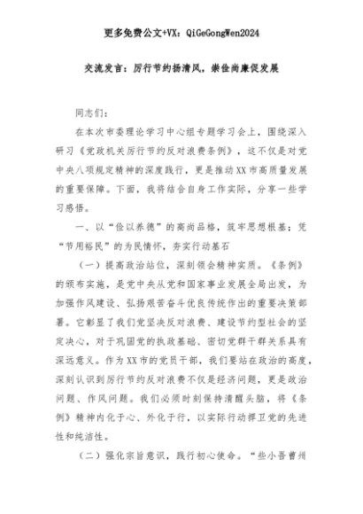 【七哥公文】2025年:交流发言:厉行节约扬清风,崇俭尚廉促发展+更多免费公文+VX:QiGeGongWen2024+更多免费公文+VX:QiGeGongWen2024