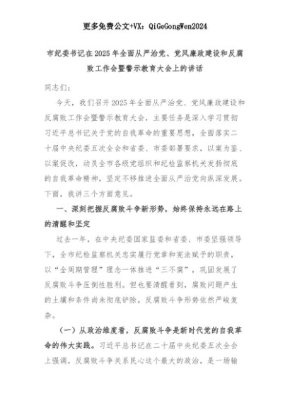 【七哥公文】2025年:市纪委书记在2025年全面从严治党、党风廉政建设和反腐败工作会暨警示教育大会上的讲话+更多免费公文+VX:QiGeGongWen2024+更多免费公文+VX:QiGeGongWen2024